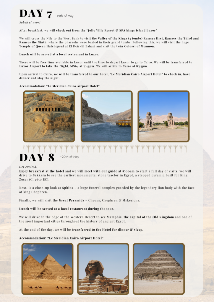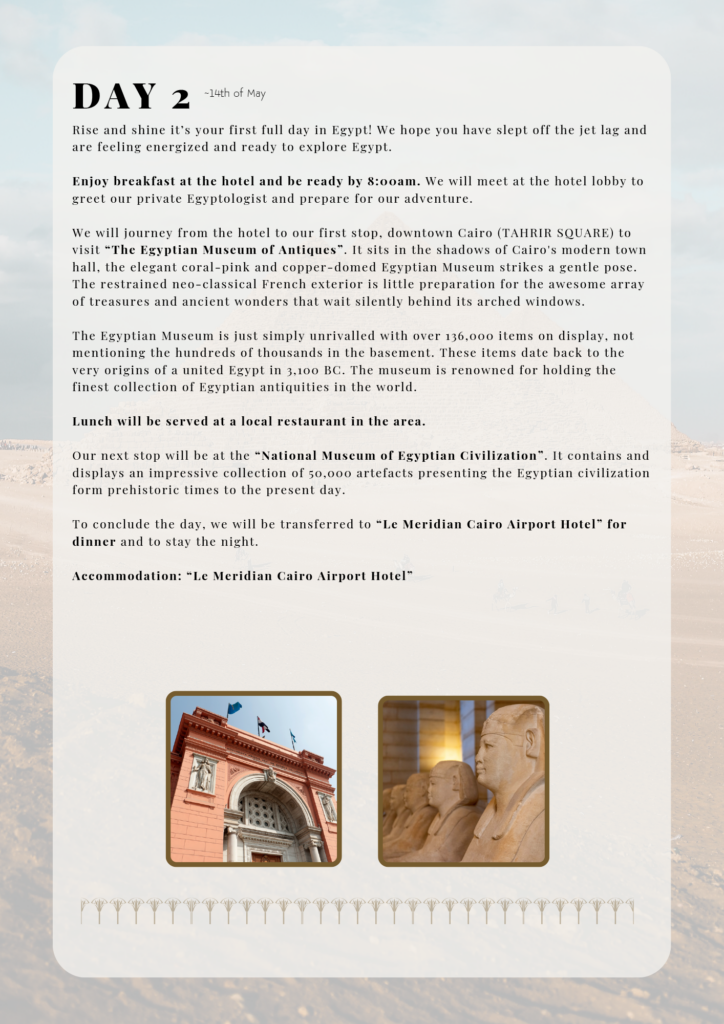 - Entrance fee tickets to all sights are included. However, if wanting to enter the Great Pyramid, it will cost an extra $15 USD per person.